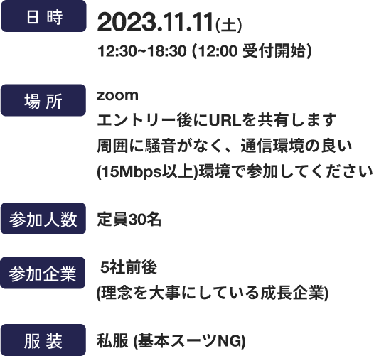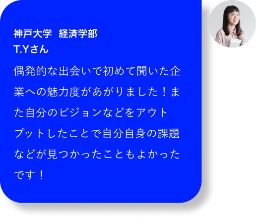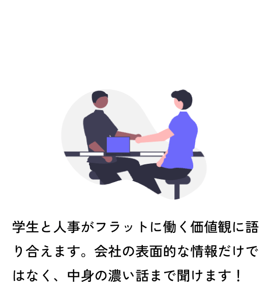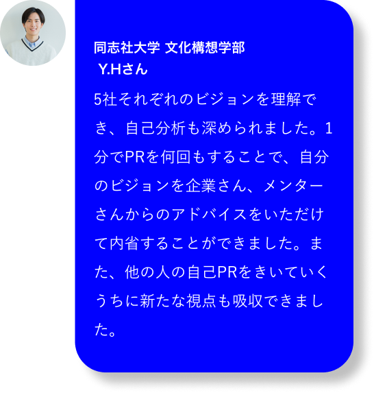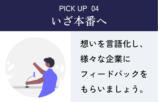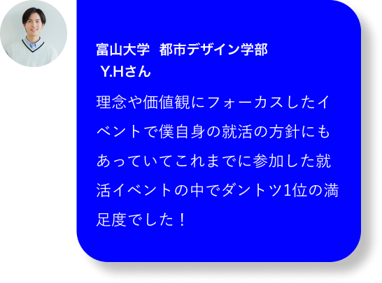 自分がこれまでに大切にしてきた 価値観、 これから先のビジョンに 絞って自己PRを行い、 企業からフィードバックがもらえる & 特別スカウトが貰えるイベントです。
